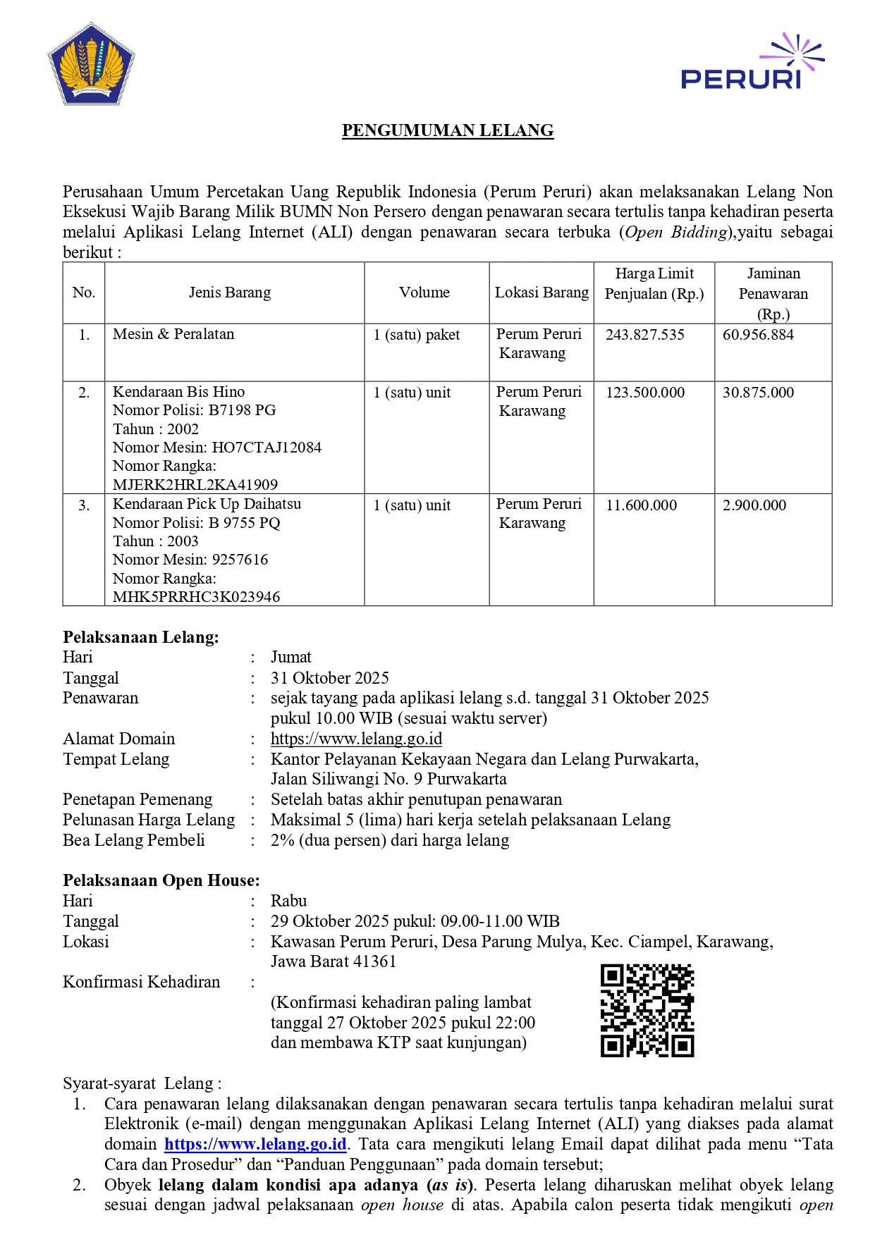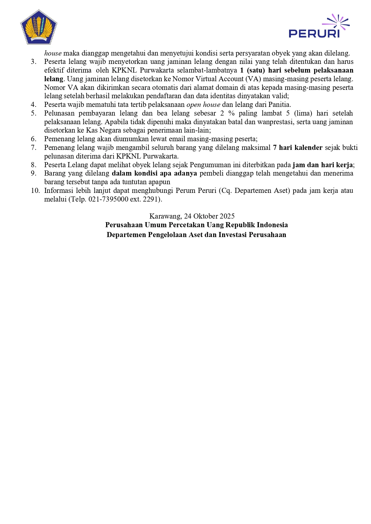 Pengumuman Lelang Aset Tetap Peruri - Karawang