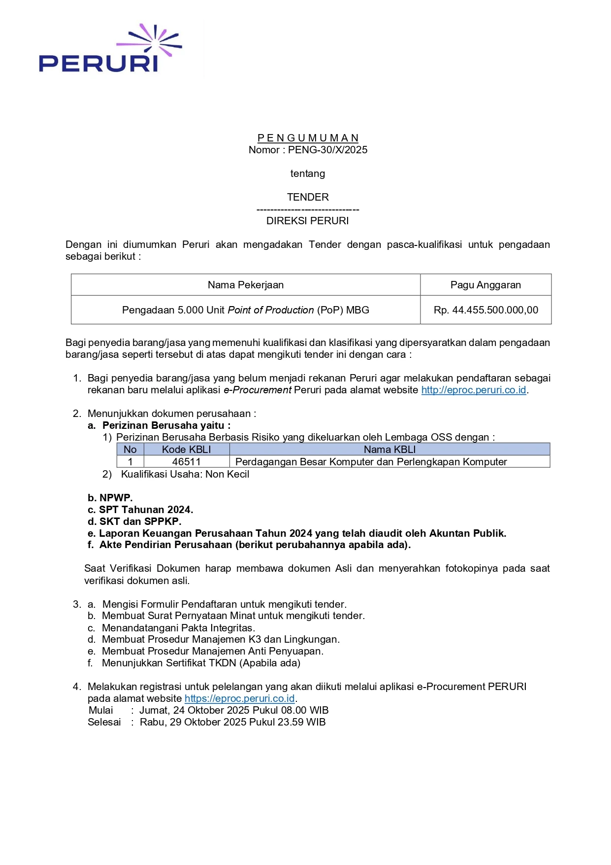 Tender 5.000 (Lima Ribu) Unit Point of Production (PoP) MBG